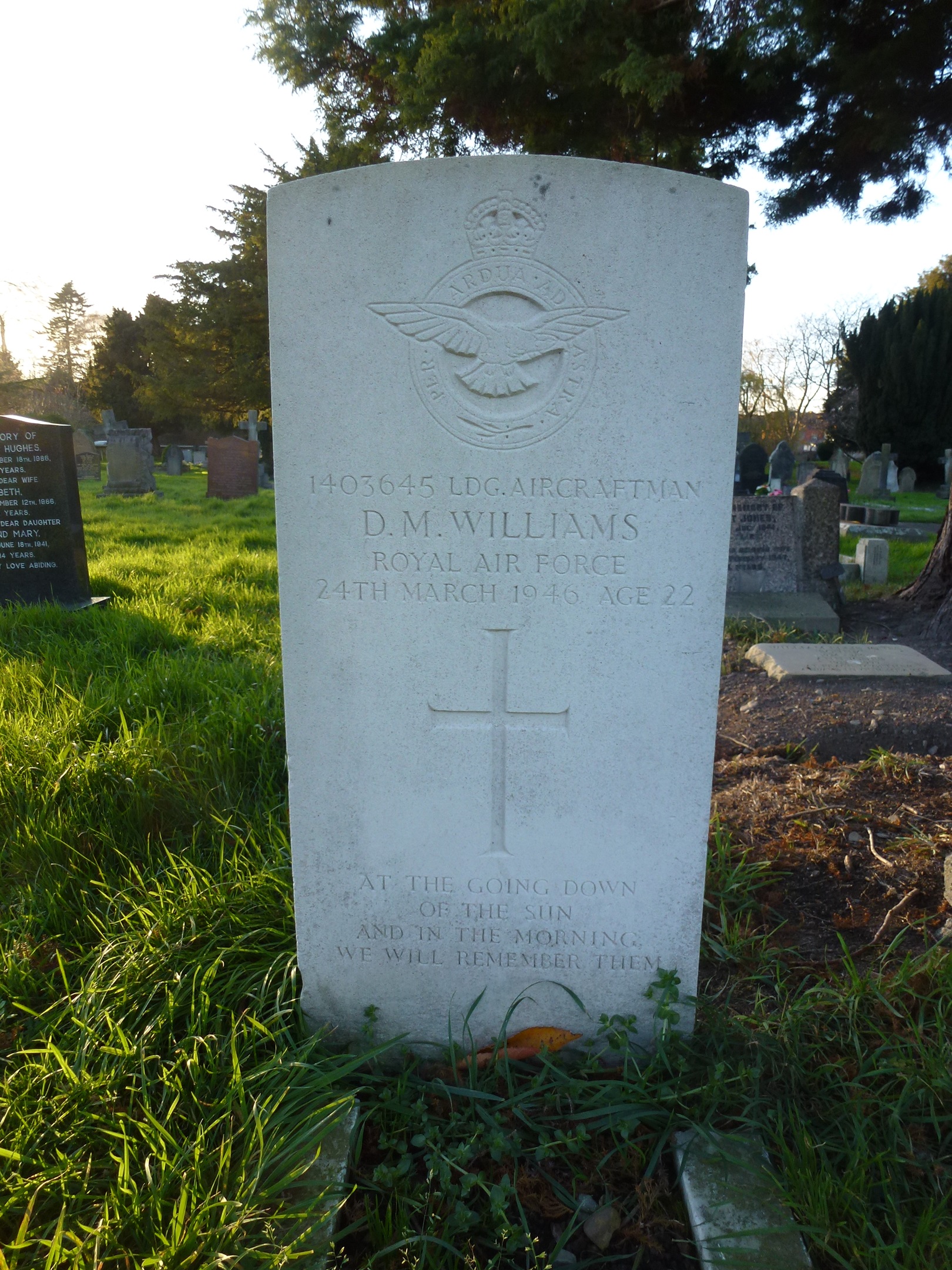 He was serving at RAF West Kirby at the time of his death, the cause of which has not yet been ascertained, but it occurred in the RAF Hospital at Wroughton. He is buried in Portsmouth (Kingston) Cemetery. |