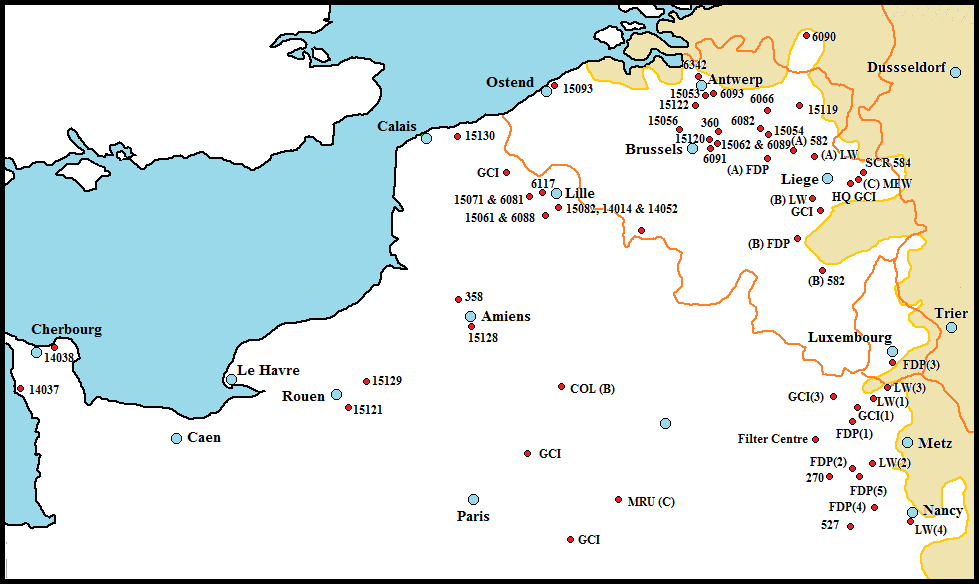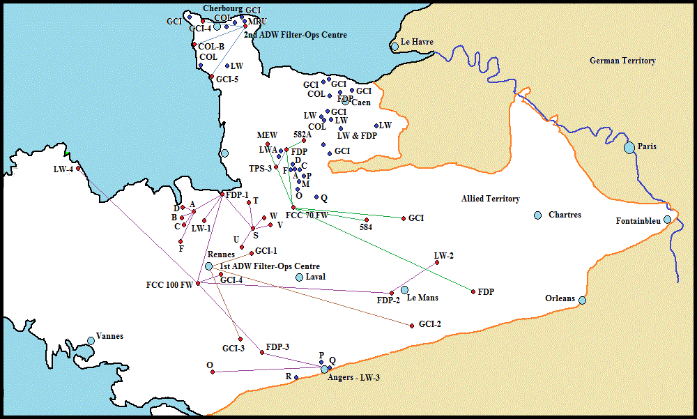 The map above shows the relative distances of radar units from the front-line despite attempts to keep up with the Armies' advances. Unfortunately the original document from which this map was prepared does not include a key so it is difficult to determine the purpose of some of the units (particularly the ones shown by single letters). However, it is assumed that the units shown in red are working with the IXth Air Force USAAF, whilst those in blue are working under the control of 2nd Tactical Air Force.