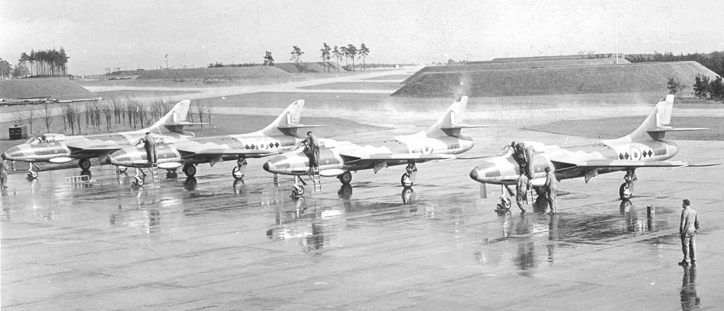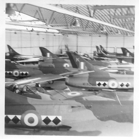 Hunters of No 71 Sqn in the Hanger, 1956 | Close up of 71 Sqn's Eagle | Line up of No 71 Sqn's Hunters prior to their final sortie, 1957 |